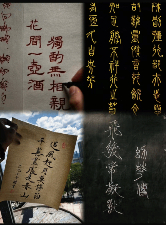 “一笔一划皆修行,纸间墨色见真章”。初握毛笔时,他还是个连握笔姿势都生疏的 “书法小白”,面对起笔、行笔、收笔的细腻门道,常因线条歪扭、结构松散而沮丧。但他没让挫败浇灭热情:从每日清晨雷打不动的半小时控笔练习开始,对着字帖逐字拆解笔画走势,把 “横平竖直” 的要义刻进肌肉记忆;遇到篆隶的盘曲笔法、行楷的牵丝连带,就泡在书法教室反复临摹,手指磨出薄茧也不肯停笔。为了找准笔墨的 “力透纸背”,我跟着老师啃透《兰亭序》的灵动、《多宝塔碑》的沉劲,把字帖里的章法拆解成笔记,再转化为自己笔下的舒展。从最初连一张完整作品都难完成,到后来能写出 “独酌无相亲,花间一壶酒” 的意韵、“追风赶月莫停留” 的洒脱,砚台里的墨香,是无数个伏案日夜攒下的坚持 —— 原来所谓 “小成”,不过是把 “不想放弃” 写满了每一张毛边纸。