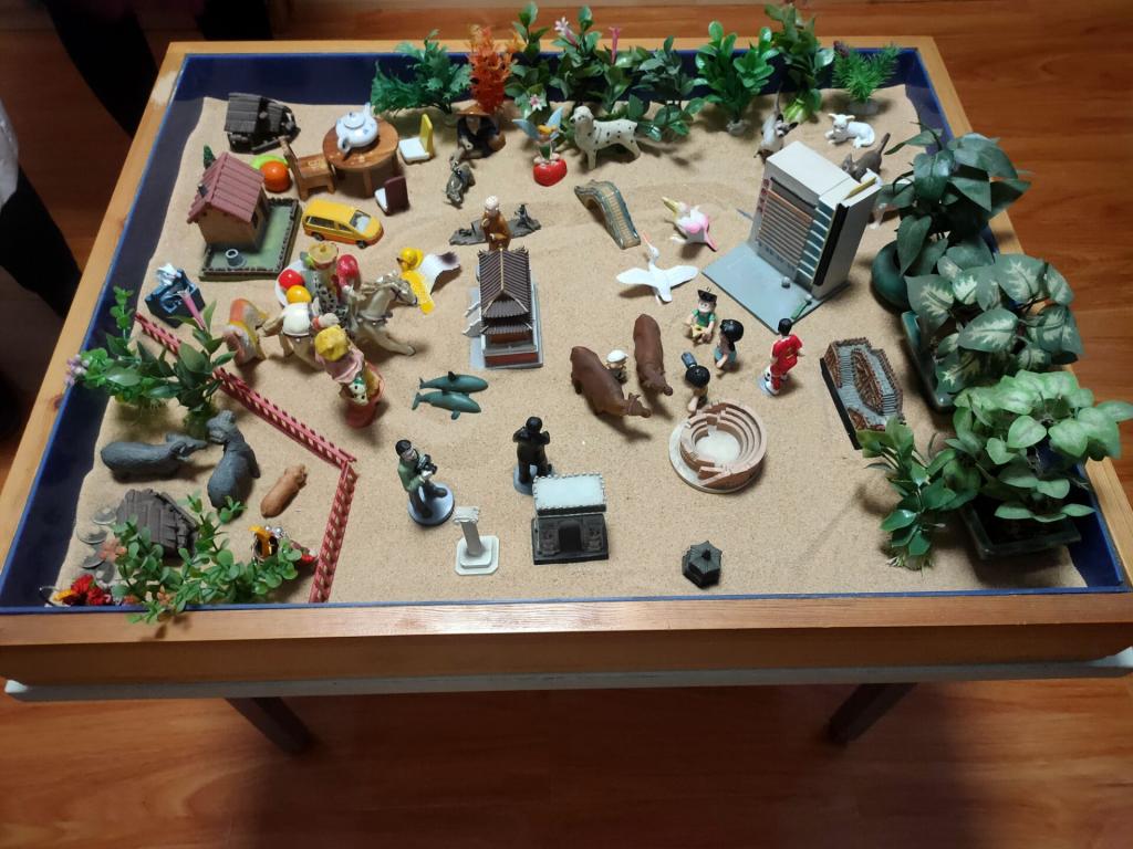 “一沙一世界,一花一天堂”,沙盘虽小,却能折射隐藏的内心世界,将自己心里的感受、情感、思维等内化的心理活动外显。在上周活动的基础上,老师们很快进入了状态,经猜拳决定活动顺序之后,小组成员在静默中依次完成了沙具的摆放或移动。借助沙盘和沙具,团队成员开放自己,与自我对话,这是团队沟通的首要条件。最终,沙盘呈现出与第一次迥异的风貌。任老师结合第一次活动情况,在保证了群体安全感的基础上,逐一对常见意象做了简要解读,有效的促进了大家认识自己,认识别人,并在与人互动中学会调整自己,适应他人,适应团体,最终获得成长。