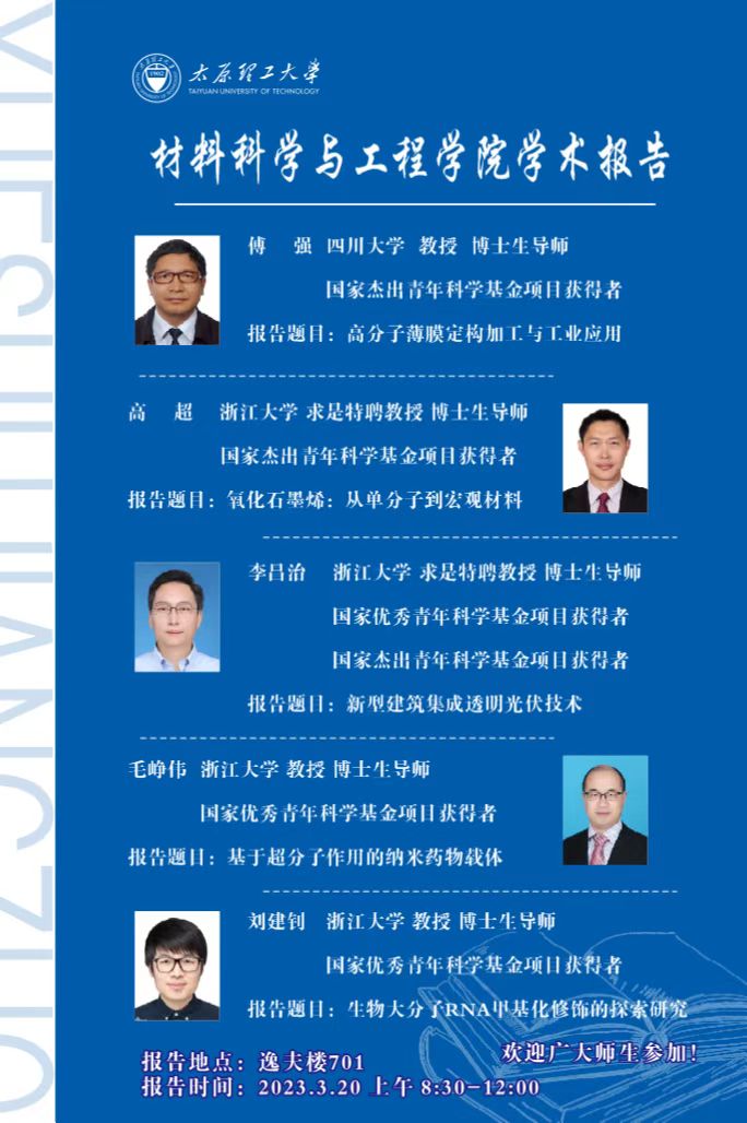 3月20日,浙江大学高分子系一行7人来我校yl6809永利集团进行学术交流,4位杰出教授应邀于迎西校区逸夫楼701做学术报告。本场学术报告由yl6809永利集团院长王晓敏主持,学院部分教师、学生参加。