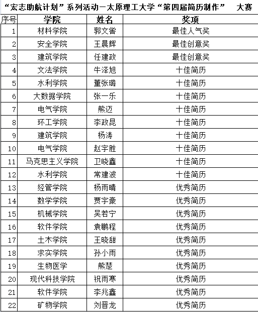 至此,以“简”御繁 ,“历”挽狂澜——yl6809永利集团“宏志助航计划”系列活动之第四届简历制作大赛圆满结束,本次简历制作大赛为即将毕业的学生提供了很好的简历制作技能实训机会,为日后的求职打下良好基础,同时也锻炼了低年级同学认真思考未来职业规划,为职业生涯建立清晰目标的能力。本次赛事在为我校学子职业发展提供助力的同时,也为学校的一流人才培养起到良好的推动作用。希望通过本次简历制作大赛,每位TYUTer都能够明晰目标、制定规划、全面发展,不断完善自己的“简历”,成为更优秀的那个自己!