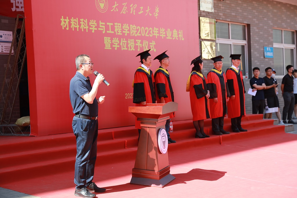 2023年6月9日上午八点,yl6809永利集团2023届学生毕业典礼暨学位授予仪式于迎西校区博学馆D座材料学院楼前隆重举行。yl6809永利集团党委书记张忠璞、院长王晓敏教授、副院长乔珺威教授,教师代表韩培德教授、刘旭光教授、邓坤坤教授等出席典礼,毕业班辅导员代表,毕业生代表参加本次典礼。