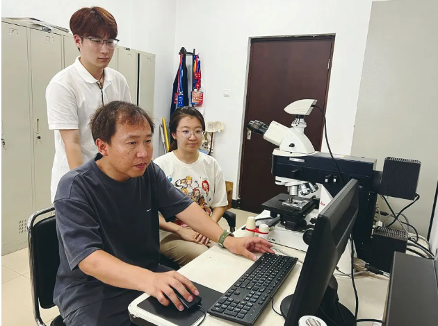 ▲ 张敏(左一)指导学生进行金相实验 受访者供图