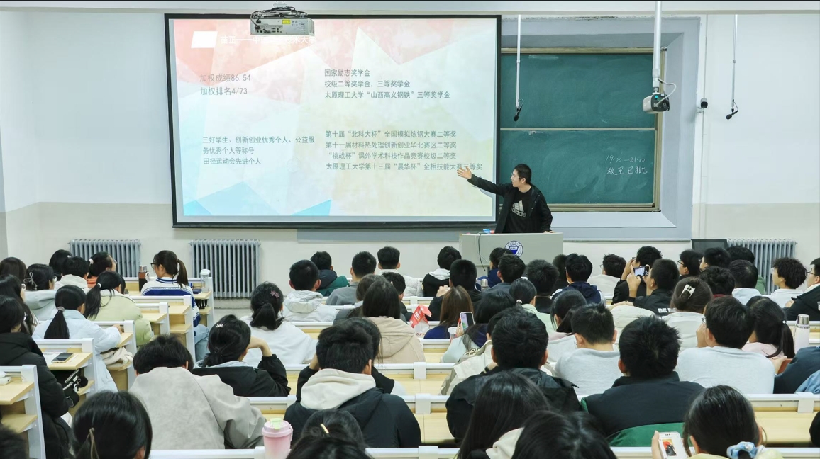 宣讲会上,四位已保研至国内顶尖高校的优秀学生代表依次登台,分享他们的奋斗历程。叶禹岑(加权90.58,专业第3,保研北京大学)连续两年荣获国家奖学金,在美国大学生数学建模大赛、全国英语演讲比赛等领域屡获殊荣,并在游泳、田径等体育赛事中表现突出,目前已以第一作者身份在Materials Letters接收论文一篇。姚博豪(GPA 4.07,保研清华大学)曾获四项校级奖学金,参与的国家级大创项目“倍容量导线用高强殷钢丝材制备”获优秀结项,并在中国科学院金属研究所完成科研实践。路景宇(GPA 4.61,加权93.22,保研浙江大学)荣获“青鸥奖”“山西建投教育奖”等多项荣誉,在全国大学生英语、数学、文学作品竞赛中均有斩获,并参与电催化相关课题研究。苗正(加权86.54,专业第4,保研中国科学技术大学)曾获国家励志奖学金,在“北科大杯”全国模拟炼钢大赛、材料热处理创新创业大赛等专业竞赛中表现优异。