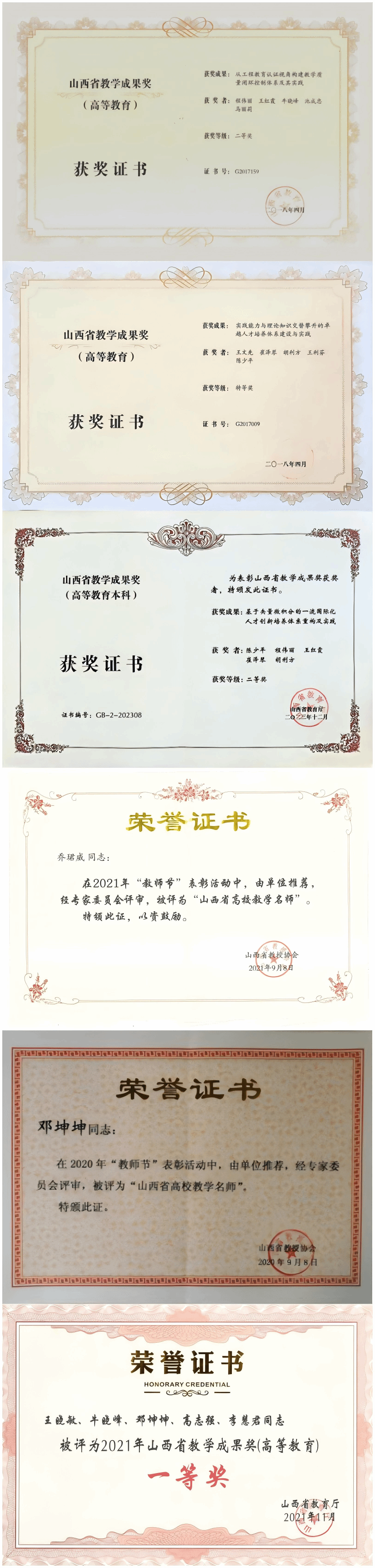 “CJ奖励计划”青年学者1人,山西省工人先锋号教学团队1个,省级重点实验室1个。荣获省级教学成果特等奖1项、一等奖1项、二等奖2项,形成了一支人才荟萃、梯队合理的教学、科研和产业开发教师队伍。年均发表高水平论文过百篇。承担国家自然科学基金、山西省自然科学基金、省攻关项目、横向合作项目数十项。
