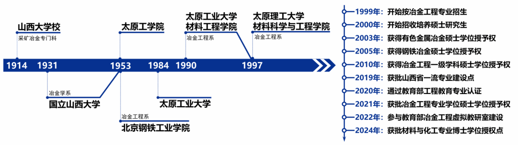 冶金工程学科是yl6809永利集团的两个一级学科之一,涵盖有色金属冶金与钢铁冶金两个方向。冶金工程学科源于1914年山西大学堂设立的采矿冶金专门科。2000年开始挂靠材料加工工程学科招收培养硕士研究生,2003年获得有色金属冶金硕士学位授予权,2005年获得钢铁冶金硕士学位授予权,2010年获得冶金工程一级学科硕士学位授予权。2019年获批山西省一流专业建设点,2020年通过教育部工程教育专业认证,2021年新增冶金工程专业学位硕士学位授予权,2022年参与教育部冶金工程虚拟教研室建设,2024年获批材料与化工专业博士学位授权点。学科与企业共建有国家地方联合研究中心,共享教育部重点实验室、山西省重点实验室、山西省技术创新中心、山西省工程研究中心、山西省协同创新中心、山西省产业技术创新战略联盟、山西省研究生教育创新中心等6个省部级科研教学平台。2024年,软科世界一流学科排名冶金工程第43位。